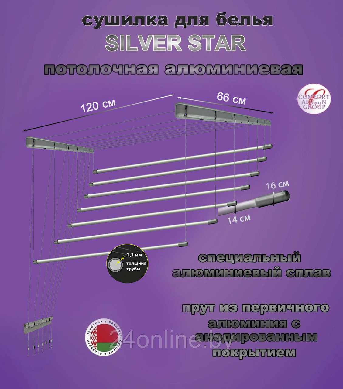 Сушилка для белья потолочная 7 прутьев «Silver Star» - эксклюзивная модель премиум-класса. Это новинка от белорусского производителя с семью усиленными прутками из алюминия, обладающая рядом высококачественных материалов, которые делают ее надежной и долговечной. Прутья выполнены из суперпрочного анодированного алюминия, что гарантирует их стойкость к коррозии, трещинам и деформации. Более того, они возвращаются в исходное ровное состояние после использования. Они в 2,5 раза легче стальных, поэтому снижает давление на комплектующие. Анодированный алюминий — экологически чистый материал, он не выделяет вредные вещества даже при высокой температуре и влажности.